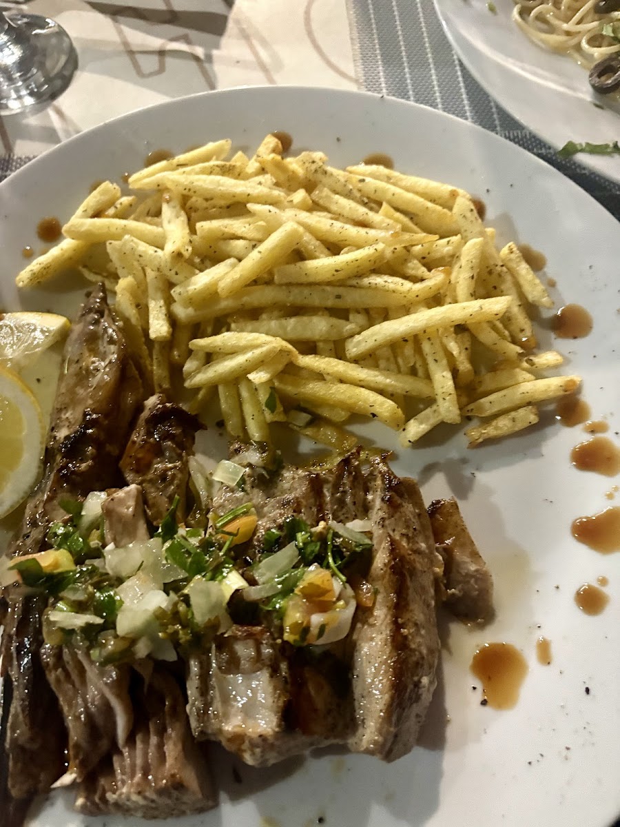 Very delicious food. A small menu written on a board with a few fish dishes on one side, and a few meat on the other. We got two types of fish and loved both. Lots of outdoor seating on a very pedestrian street, and a tiny stage for local musicians which set a lovely atmosphere. The staff seemed a bit overloaded by the number of guests, but they were always super friendly so not truly something to complain about.